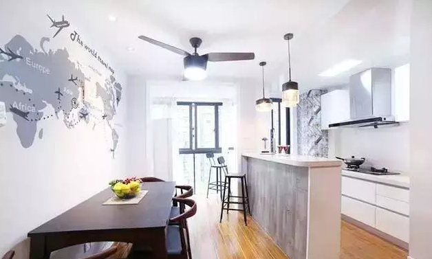 ▲ 開放(fàng)式廚房(fáng)和餐廳交接的地方設計(jì)了一個吧(ba)台。北歐風(fēng)格有的純潔的白(bái)色,總給人(rén)一種幹淨純潔的感覺。