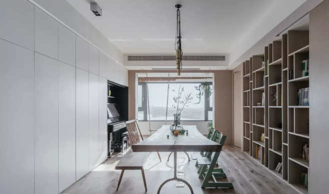 等孩子再大(dà)一些,到了上小學,就(jiù)要考慮看(kàn)書(shū)、做作(zuò)業、各種興趣愛好培養。這個時候,可(kě)以在上一個階段的基礎上改造一下,有更多的書(shū)櫃。 也有人(rén)直接在客廳放(fàng)一張大(dà)長桌,可(kě)以解決餐桌、書(shū)桌等各種功能。