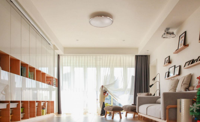 娃長大(dà)一些,幼兒園階段,喜歡自(zì)己玩玩具,自(zì)己看(kàn)繪本或者讓父母講故事(shì)的階段,适合像上圖這樣的客廳裝修。在空無一物的基礎上,考慮設計(jì)充足的收納來(lái)解決繪本和玩具的存放(fàng)。